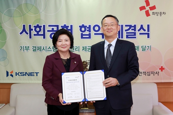 이제 언제 어디서든 신용카드로 기부하자 (서울=뉴스1) 박응진 기자 = 대한적십자사는 신용(체크)카드 결제로 기부가 가능한 새로운 시스템을 도입하기 위해 ㈜케이에스넷과 협약을 맺었다고 7일 밝혔다. 적십자는 이를 위해 이날 오전 10시30분 서울 중구 적십자사에서 케이에스넷과 사회공헌협약을 맺었다. 케이에스넷은 이번 협약을 통해 이번달 내에 자사 카드 단말기를 사용하는 전국 40여만개 가맹점에 신용카드 기부 결제시스템을 도입할 계획이다. 케이에스넷은 또 자사 단말기를 이용하는 가맹점들이 매월 일정 금액을 적십자에 지원할 수 있도록 '희망풍차 나눔명패' 달기 운동을 실시할 예정이다. 케이에스넷은 국내 온·오프라인 카드결제 업체로 연간 카드결제 건수가 14억4000여만건에 달한다. |